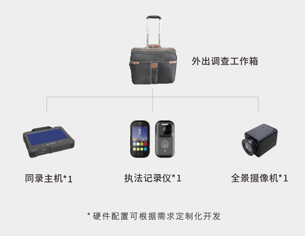 定制调查工作箱,拎包即走 针对同录主机及其配件,定制外出调查工作箱,配备同录主机一台。其他硬件包括:全景摄像机一台,执法记录仪一台。外出调查取证时拎包即走。 全程同步录音录像覆盖,1080P分辨率 1. 双光驱实时同步直刻:支持标准光盘实时刻写,实时、同步对同一调查现场的音视频信息进行双光盘刻制。 画面合成,确保真实公正 配备全景摄像机、执法记录仪,调查现场特写画面与全景关联场景同步拍摄,并以画中画的方式进行显示和固定,满足调查现场画面真实,公正的要求。 自动封盘,稳定可靠 采用即停即封技术,支持续刻、补刻、自动封盘、光盘基础数据检测等实用功能,确保光盘性能稳定、可靠。 随时回看,无需安装播放器 设备支持光盘回放、硬盘回放、网络回放等功能,无需安装特殊播放软件即可对光盘内容进行回放。 |